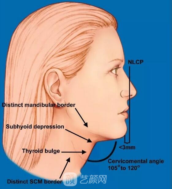 鼻唇角、鼻額角大家應該是比較熟悉了吧,那么頦頸角你了解嗎?頦,其實就是我們的下巴;頸,就是脖子,而頦頸角就是下巴、下頜脖頸交接點與脖頸直線的夾角,英文名叫Cervicomental angle,下圖紅線的夾角就是頦頸角。